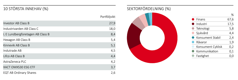 Jag har tycker det är klurigt med koncentrationen med 46% i två bolag även om jag fattar att man behöver bryta ner Investor. 70% av fondens innehav ligger i 6 bolag. Fonden kvalar ju inte ens in som en UCITS-fond. De skriver själva “Totalt är vi indirekta ägare i fler än 75 börsnoterade bolag.”