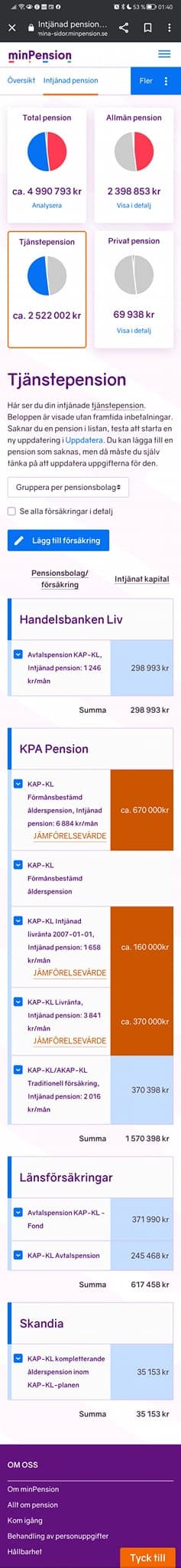 Det ser ut som att alla dina försäkringar tillhör KAP-KL utom eventuellt en hos KPA som står som AKAP-KL/KAP-KL. Du har en stor del förmånsbestämd pension och den har inte påverkats av Corona/krig. Du har också en hel del traditionella försäkringar vilka också har klarat sig bra. Ünder 2020 och 2021 har inga av KAP-KLs tradtionella försäkringar eller pensionsbolagens entréfonder gått med förlust. I år är det självklart ett annat läge. Så jag har svårt att se att de försäkringarna skulle ha backat så mkt under den perioden. Det kan inte vara någon försäkring har fallit bort? Eller att du har haft eget valda fonder som har tagit väldigt mkt stryk? Jämför villkor och välj tjänstepension i KAP-KL | Konsumenternas