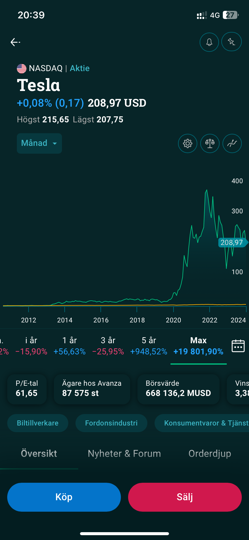 Tesla är upp cirka 20 000% senaste 14 åren för övrigt, hyfsad utveckling ändå… nästan 60% senaste året och 1 000% senaste 5 åren.