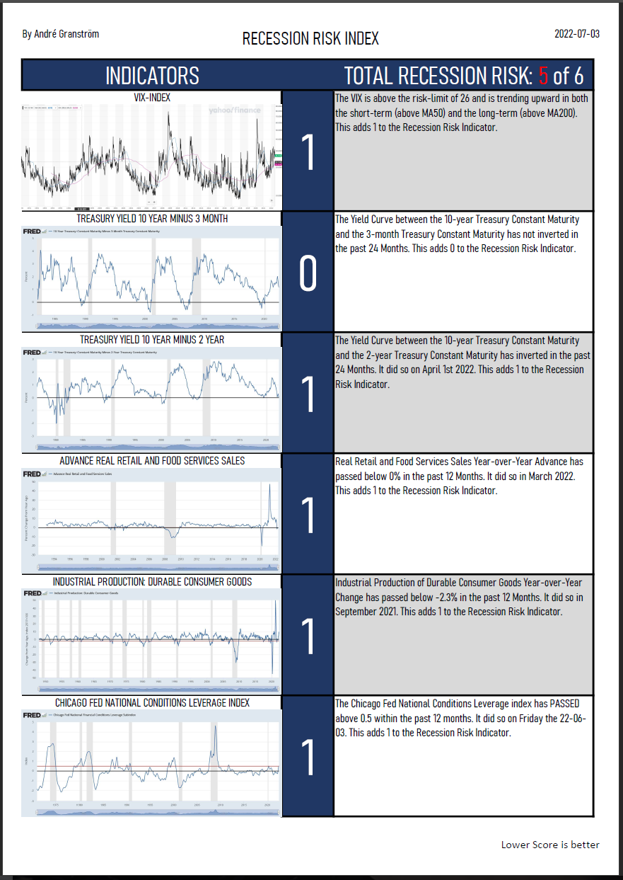 Ett sammansatt mått av flera indikatorer som historiskt varit användbara för att “förutspå” en lågkonjunktur. Dem hjälper inte direkt i tajmingen, då många av dem varnar om en lågkonjunktur “kommande 12-18 månader”, men det kan vara en bra varningens flagga.