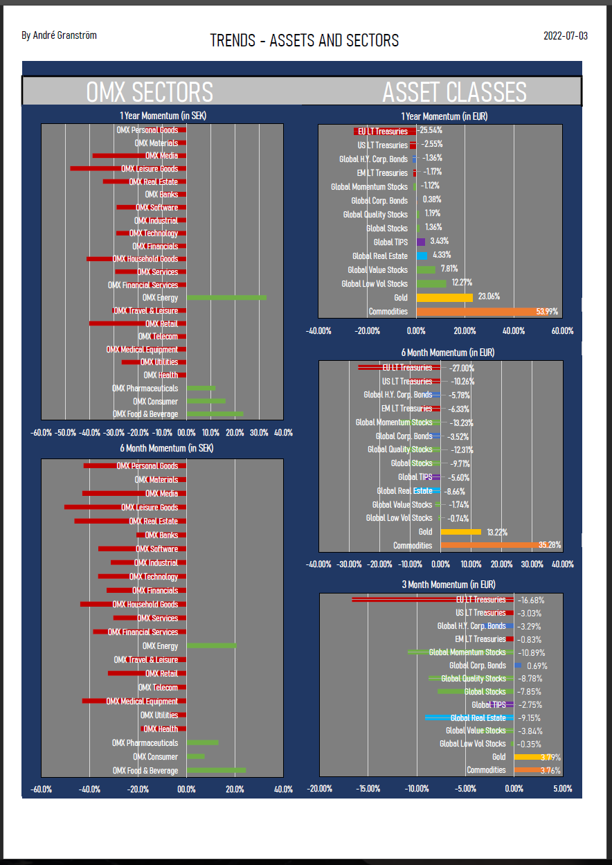 Analysen syftar i att kolla hur de stora tillgångslagen rört sig på sistone, samt även de olika sektorerna på Stockholmsbörsen. För en momentum-investerare kan detta användas för att allokera till de sektorer som gått bäst. För en värdeinvesterare kan det vara intressant att leta guldkorn i nedpressade sektorer. För en passiv investerare kan det vara intressant att få ett större perspektiv hur individuella delar rört sig. Kan även ge försmak för att diversifiera bortom Aktiemarknadsindex & Räntor, till att tex lägga till lite Guld, Råvaror, faktorer etc.