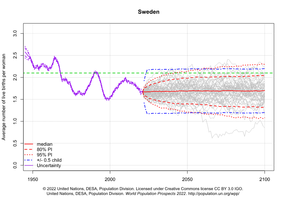 Det här är inget svenskt problem. Sverige beter sig som ett vanligt high-income land i statistiken. “Over the next few decades, migration is predicted to become the sole driver of population growth in high-income countries.” – World Population Prospects 2022.