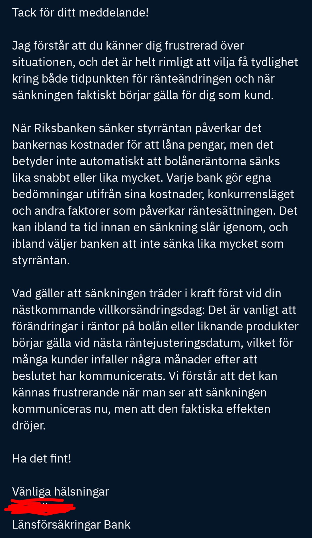 Ja, giriga företag finns ju överallt men betyder inte att det är ok eller ska normaliseras eftersom alla gör det utan vi ska fortsätta påpeka det och kalla det för vad det är. Det inte samma sak dock, bolån är ju största affär och är överlägset högsta kostnader för de flesta vanliga hushåll det är knappast ett mobilabonnemang dessutom hur det funkar med inlåning och utlåningsränta osv. Nästan alla andra banker har sänkt några dagar innan LF, LF själva har räknat med sänkning före RB besked enligt deras expert, så det igen överraskning för (kundägda) LF