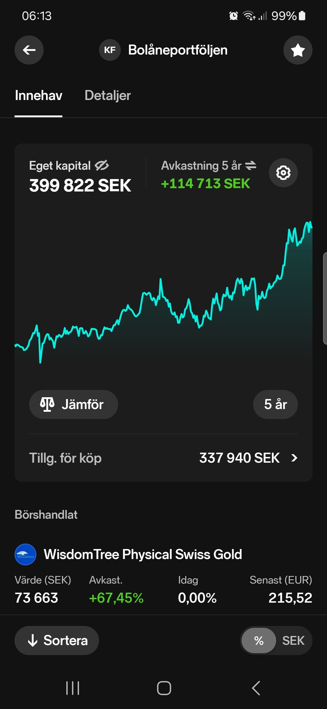 Jag har ett bolån på 1milj och när jag tog det för 5 år sedan hade jag bara bolåneskuld på 600.000 jag satte för tillfället 400.000 i rikatillsammans portfölj ( den med 25% guld) som ju i snitt skall avkasta 4-8%.avkastningen har hittills täckt bolåneräntekostnaden. I början trodde jag att avkastningen skulle räcka för att på 30 års sikt betala av hela skulden, men den har som sagt bara täckt bolåneräntan. Om det beror på det höga räntorna som vi haft senaste 2 åren eller ej är svårt att avgöra. I alla fall akönt att inte behöva bry sig om boräntekostnaden och så får man ju tillbaka 30% av räntekostnaden vid deklarationen.