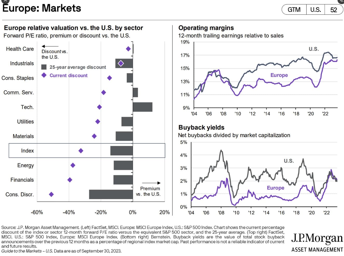 JP Morgan: Europa handlas med 35 % rabatt mot USA, dubbelt mot 25-åriga snittet. Fortsatt högre marginaler än normalt och i nivå med USA.