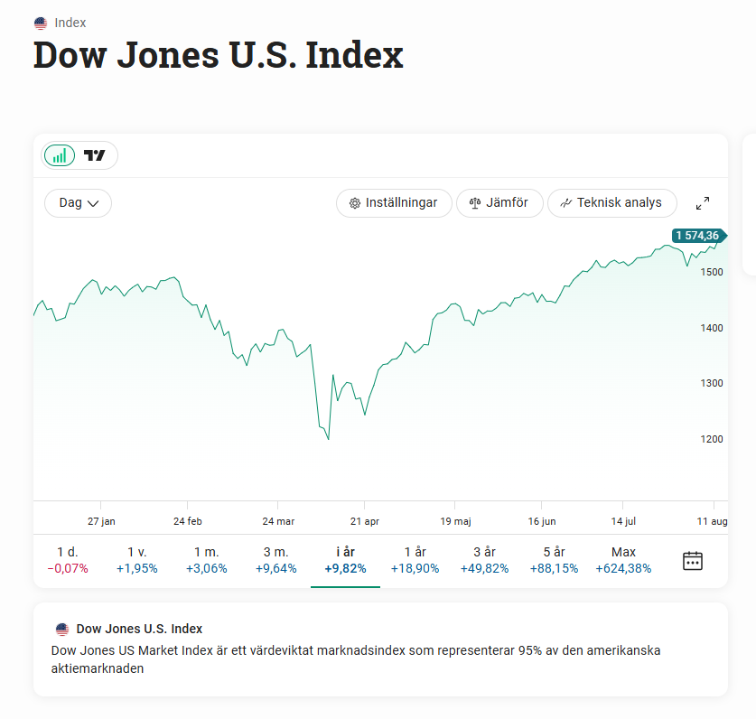 Tillägg 3: Jag förmodar att det var “Dow Jones U.S. Index” du avsåg. Dow Jones har många index, men det kanske vanligaste som avses när man säger “Dow Jones” är nog DJI/DJIA (Dow Jones Industrial Average).