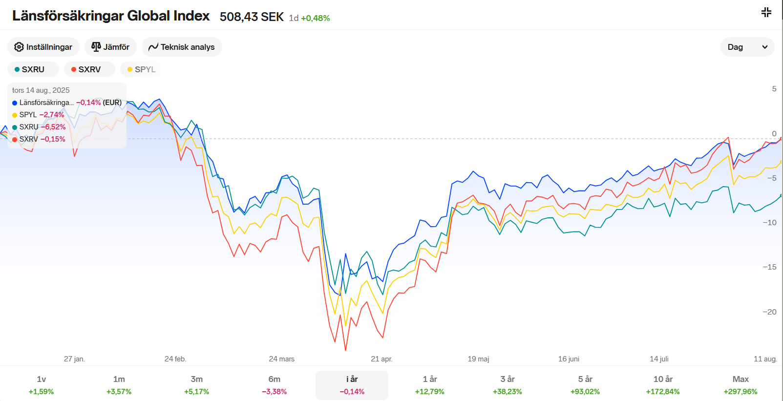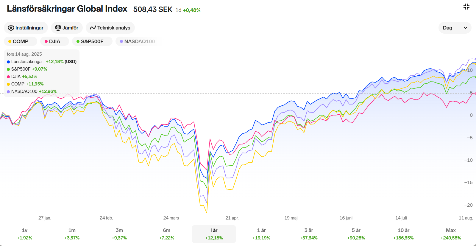 Tillägg 2: Jag hittade även ett diagram här, som jag gjort med jämförelse av utvecklingen för globala aktier (MSCI ACWI) i USD resp. SEK för de senaste 12 månaderna. Där ser man utvecklingen för i år lite tydligare och skillnaderna beroende på om man mäter utvecklingen i USD eller i SEK.
