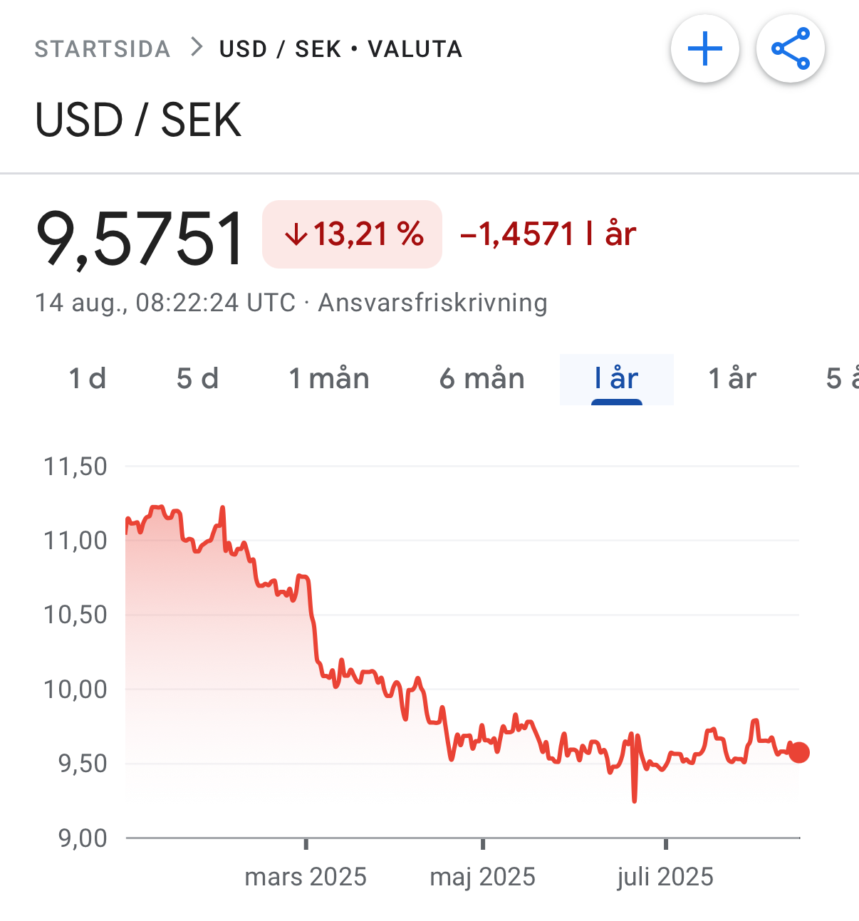 Om du vill se skillnaden mellan hur globala aktier (MSCI ACWI) utvecklats mätt i USD EUR resp. SEK under de senaste 12 månaderna, kan du t.ex. kolla här.