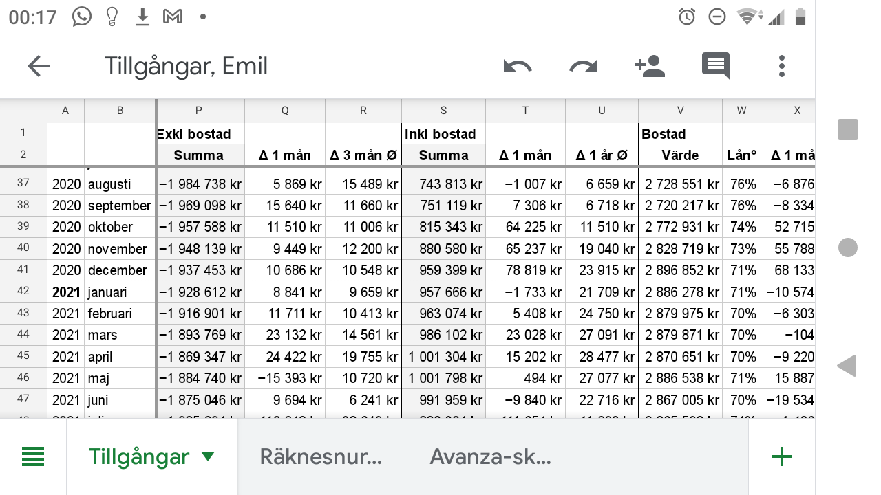 Allt annat är beräknade resultat. Mest relevanta resultatet är “Exkl avkastning och bostad, 1 mån”. Den visar hur mycket jag själv ökat nettoförmögenheten: