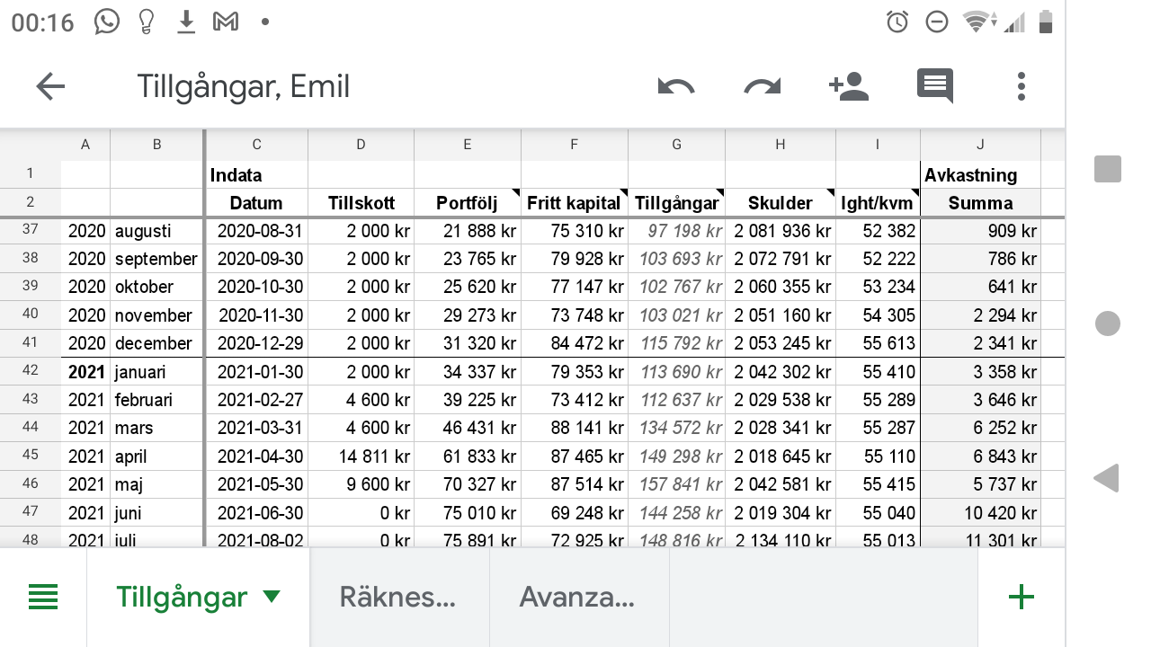 Fyll i fälten under “Indata”. “Tillskott” är hur mycket jag själv sparat till portföljen, så att avkastningen kan räknas ut. “Lght/kvm” är kvadratmeterpriset för lägenheter i mitt område, från Mäklarstatistik.