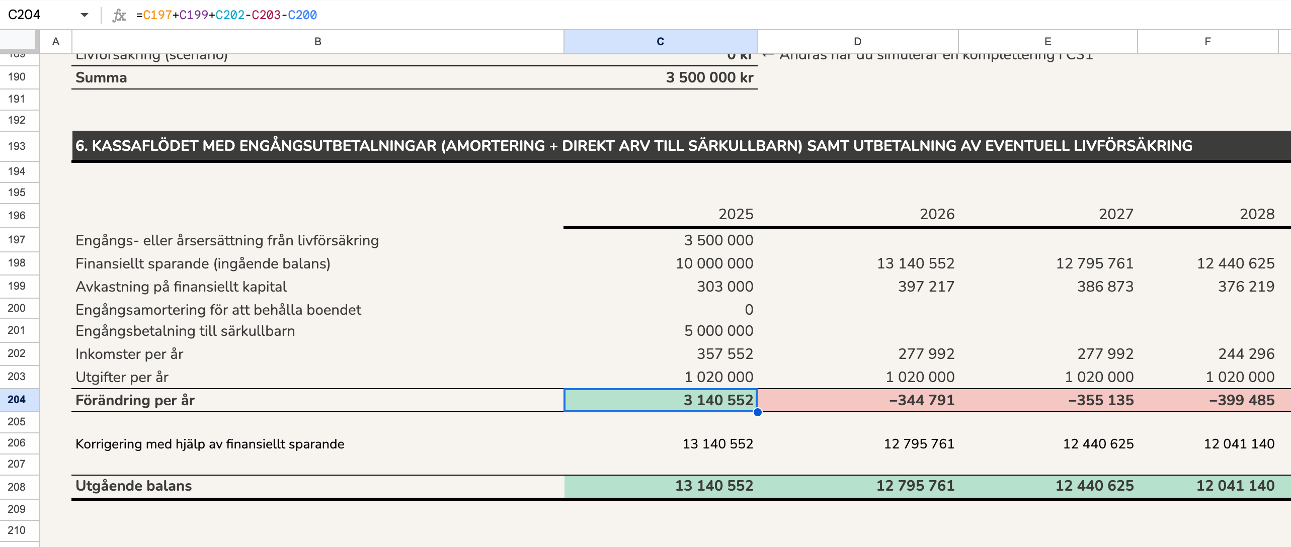 Räknar Rad 92 rätt? C92 förstår jag: Avkastning x finansiellt kapital vid dödsögonblick (även om det kanske borde utgå från dagar kvar av innevarande år och inte helår). Men D92 och framåt verkar utgå från kassaflödet i C99, snarare än C99+befintligt finansiellt kapital (om det inte behöver användas till att betala av bolån).