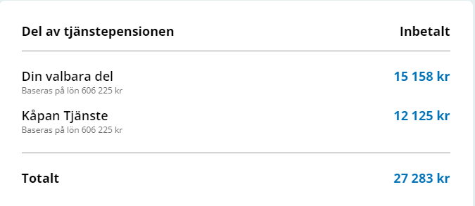 Min nuvarande tjänstepensionsavsättning har jag klippt in nedan. En ökning på det sätt jag tänker mig skulle alltså kunna blåsa upp nivån rejält.