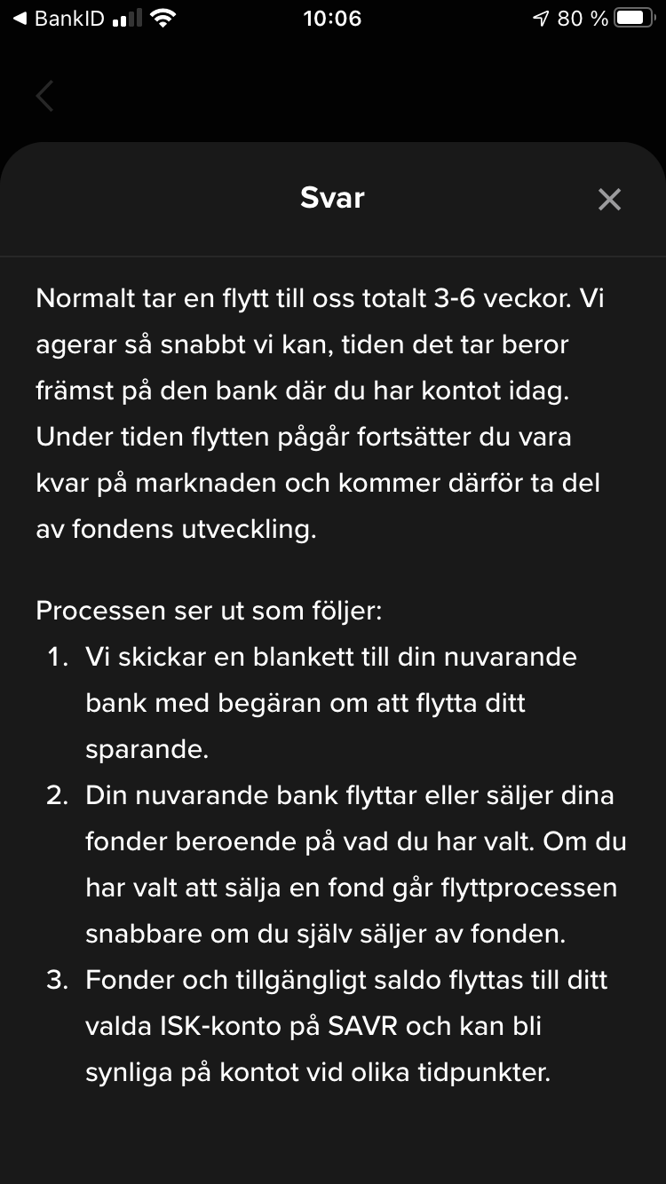 Jag gjorde själv en isk-flytt från Avanza till Nordnet, tog 10veckor för sista fonderna att trilla in… Och då kom inte mina aktier med alls, dom sålde jag och köpte på nytt.