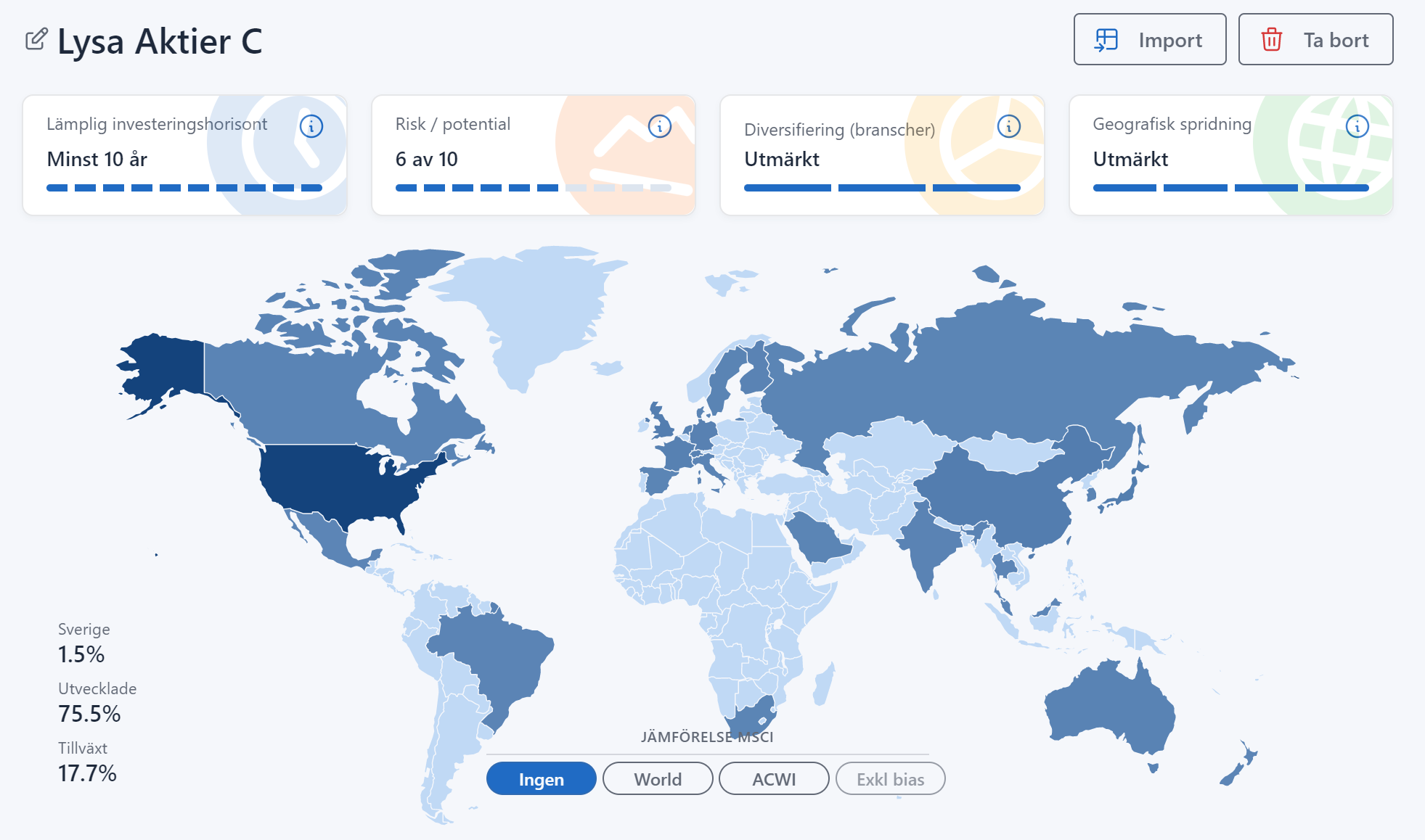 Men jag såg nu på deras hemsida att dom har en egen interaktiv karta som visar andelen aktier i varje enskilt land för Lysa Bred Och den borde ju vara uppdaterad kan man tro.