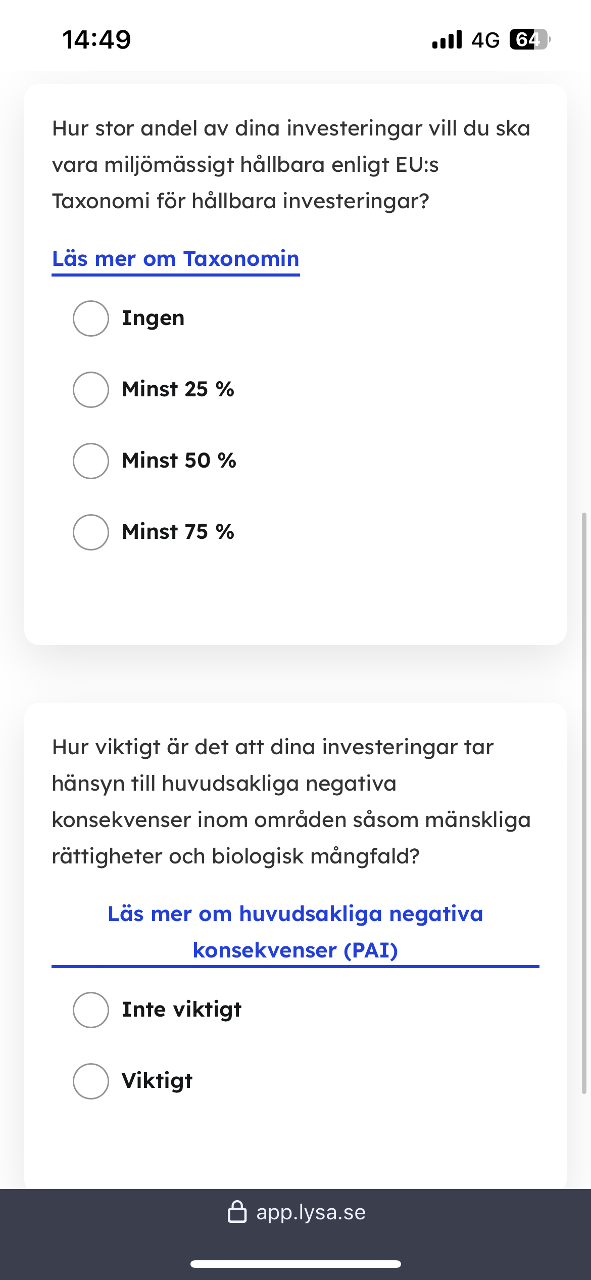 Jag har valt hållbar inriktning sedan jag började med Lysa eftersom jag är 1. Lat och 2. Inte beredd att äga vad som helst även om avkastningen möjligtvis blir högre. Känner mig trygg med mitt val även om det säkert går att hitta bättre och hållbarare. Men med hänvisning till 1. så har jag inte funderat mer på det sedan jag startade kontona för 3+ år sedan.