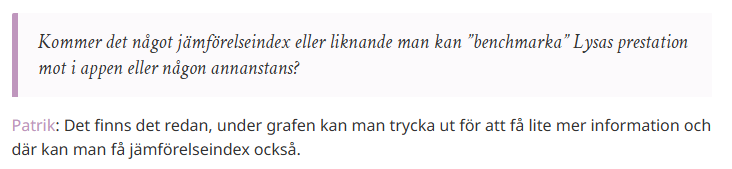 Vore det inte rimligt att presentera jämförelseindex vs LYSA (kanske plus back tracking) för potentiella kunder? Tillsammans med Lysas riktiga avkastning (låt oss säga i 10% intervaller) beroende på allokering eller i den fancy grafen de har?
