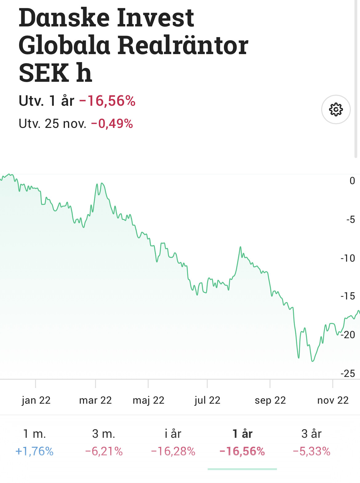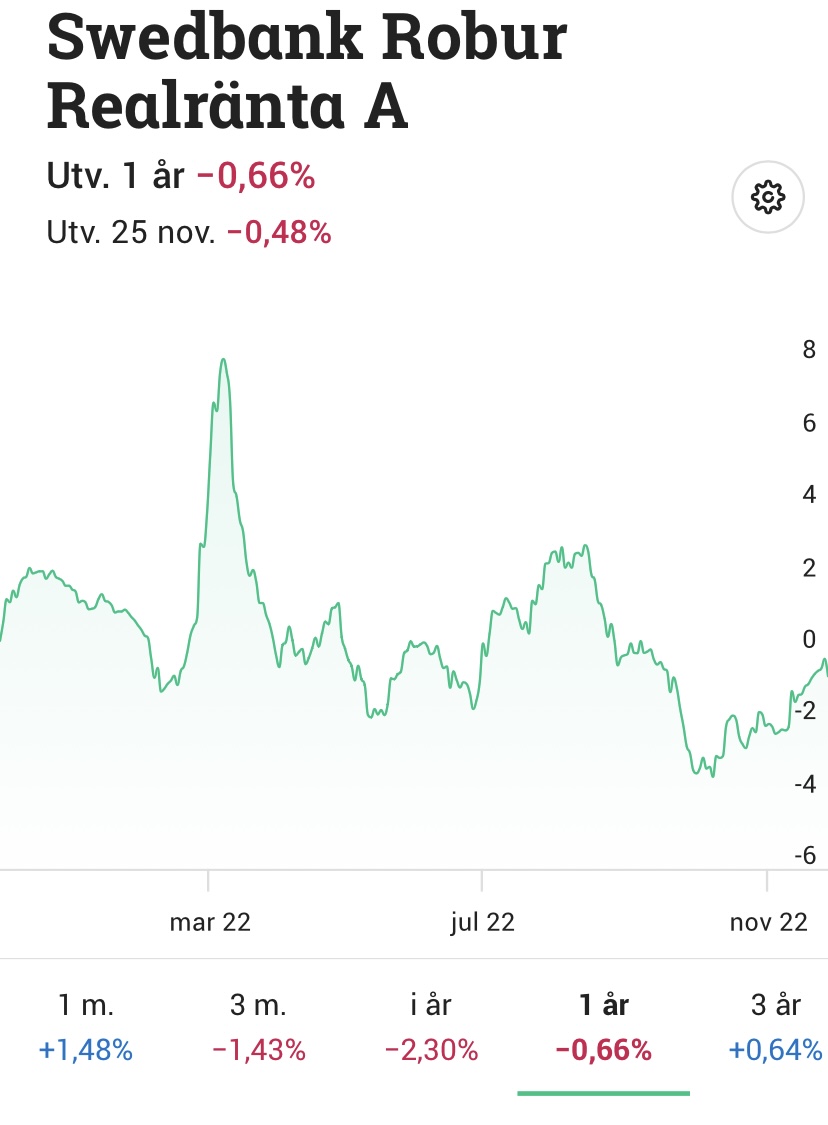 Ja nu är jag inte någon ränte expert - lång ifrån där jag bara försöker förstå detta rätt kluriga tillgångsslag speciellt realräntor känns kluriga - men gissar att durationen är så lång på realräntorna att ränteuppgången skadade obligationspriserna mer än inflationen ökade avkastningen