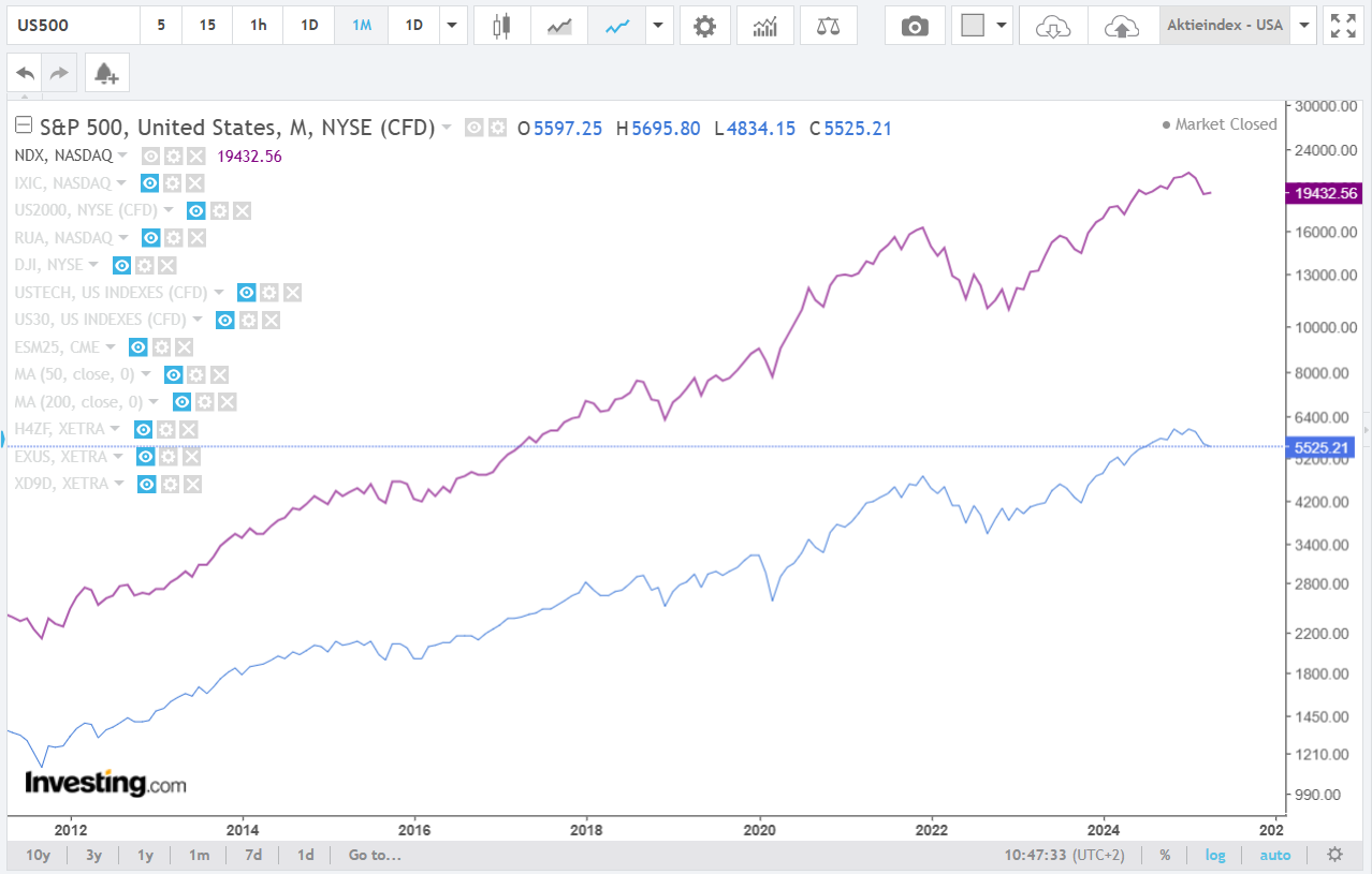 Oftast finns endast möjlighet att välja belopp i logaritmisk skala (t.ex. på investing.com), men då blir startvärdena olika om man har fler än ett instrument i samma graf och det går i praktiken inte att använda för att jämföra utvecklingen mellan instrumenten. Som exemplet nedan från investing.com (S&P 500 vs. Nasdaq 100).