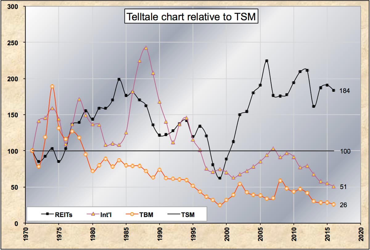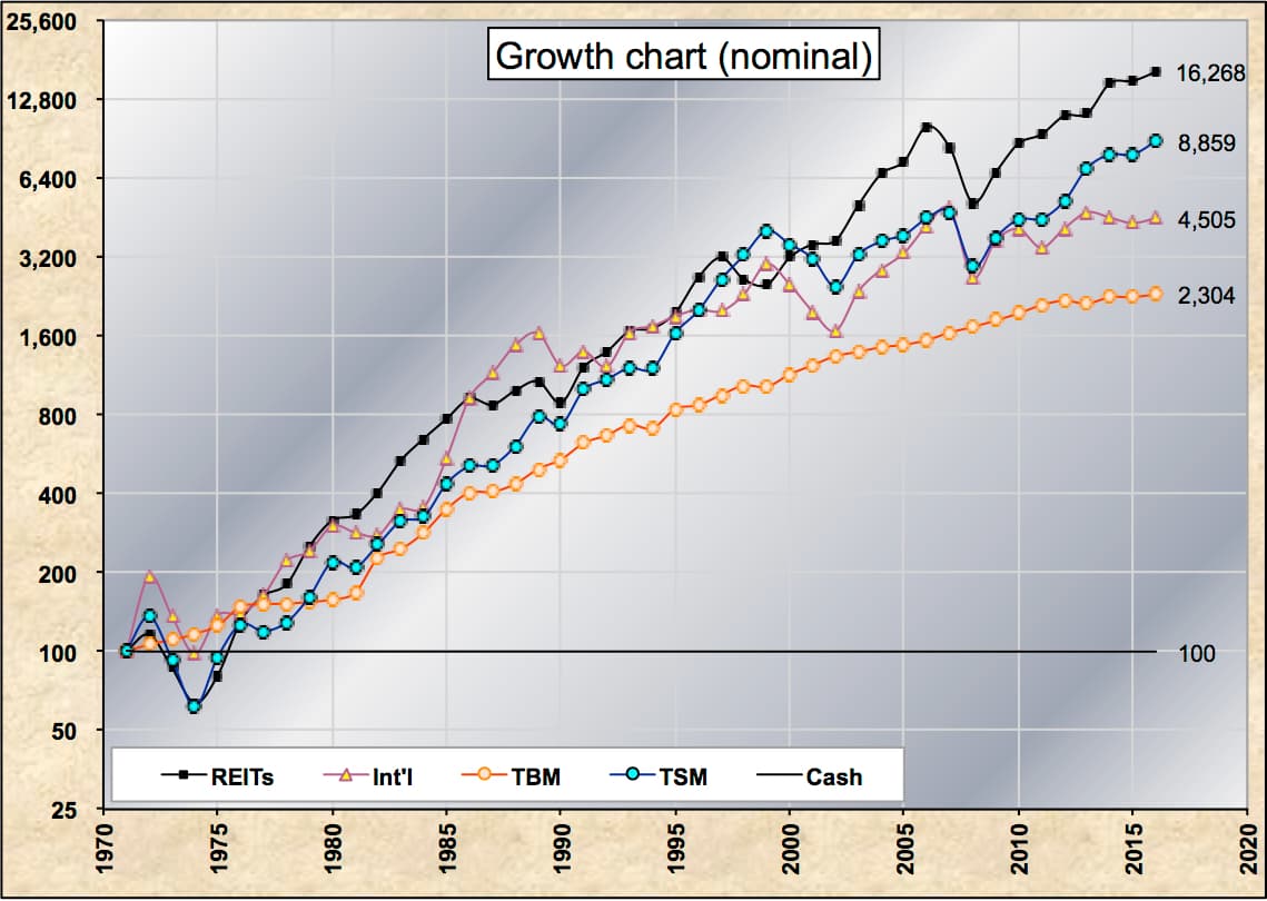 Ett ännu bättre sätt att visa jämförelser är via en “Telltale chart”, som den kallas på Bogleheads. Otroligt bra för att jämföra olika investeringar över lång tid, och man behöver inte gå till logaritmisk skala (som är svårare att förstå intuitivt när man tittar på den).