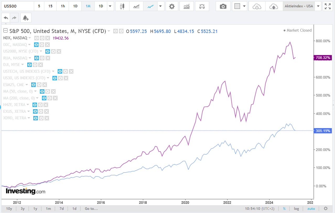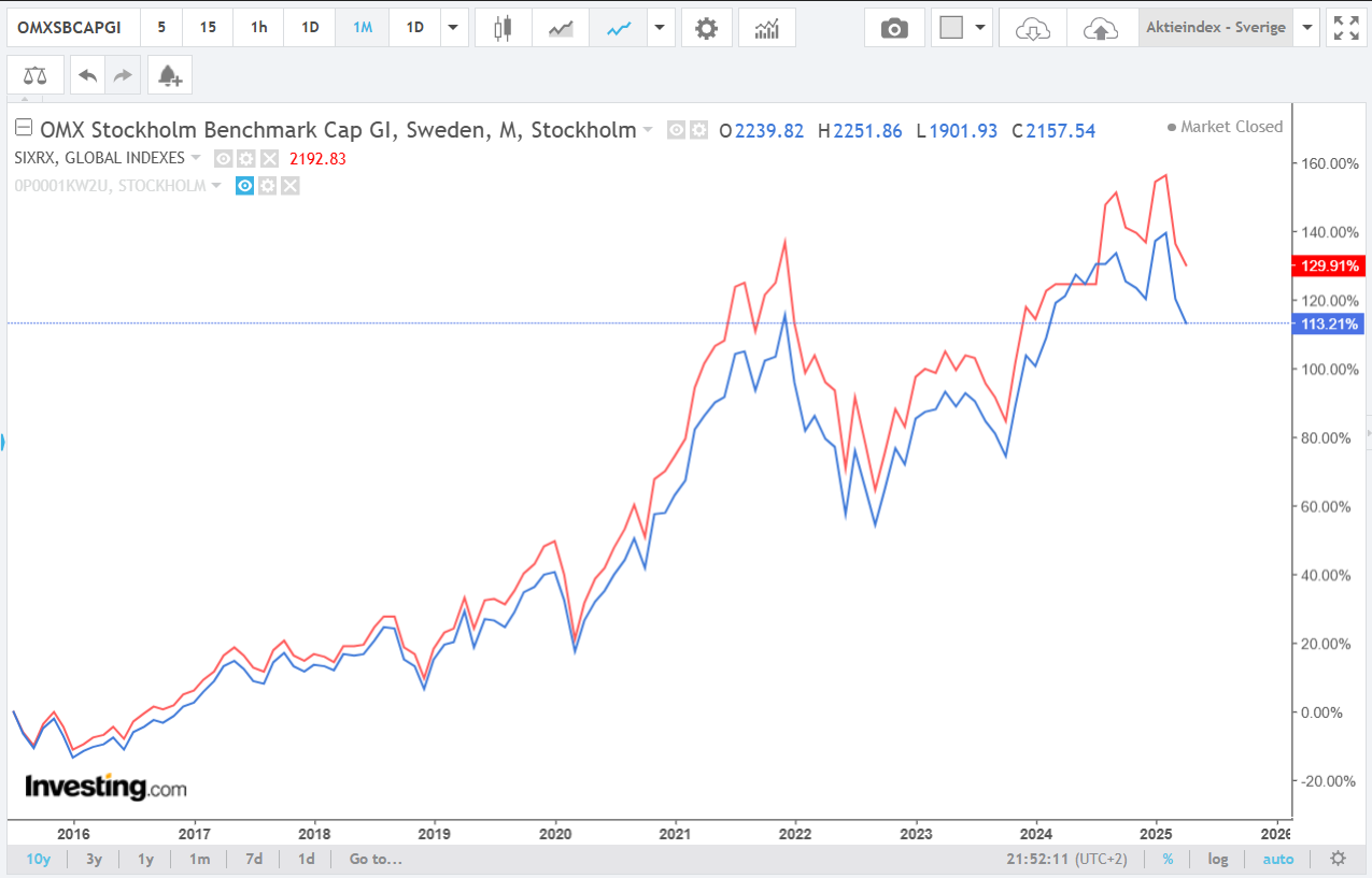 Tänk på att “den röda linjen ligger konstant över den blå” inte är samma sak som “den röda linjen presterar konstant bättre”. Konstant bättre skulle innebära att avståndet mellan dem konstant växer. På den nedre bilden ser det för mig ut som att den röda överpresterade fram till 2022, sedan underpresterade till slutet av 2024 (den blå var ju ikapp där ett kort tag) och sedan drog iväg där i ett kort hopp. Fast just det hacket kan nog vara ett fall av data som fattas eller liknande. Men en skillnad mellan 113% och 130% på tio år är inte enorm, och det är nog svårt att dra några slutsatser av det på såpass kort tid.