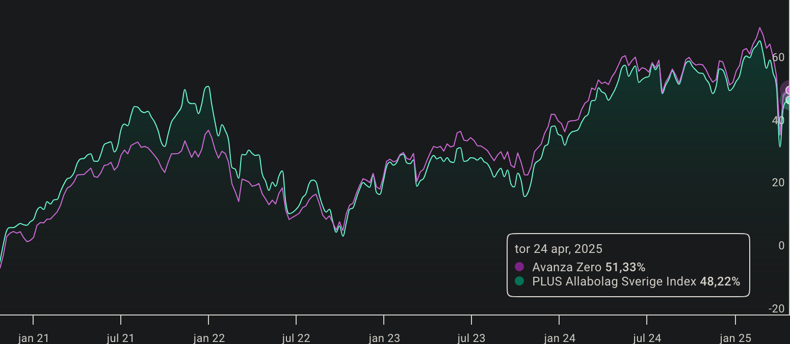 Småbolag utgör på de flesta marknader en såpass liten del av portföljen att de har en ganska liten påverkan om du inte överviktar dem. Nedan är en graf över PLUS Allabolag jämfört med Avanza Zero. Allabolag gick lite bättre 2021 men lämnade tillbaka det därefter, men på det stora hela rör de sig väldigt lika. Över hela perioden (som tyvärr är väldigt kort) har de gått i princip lika bra.