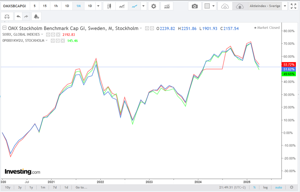 Tack! Ja det skulle jag säga. Indexen verkar följa varandra hyffsat bra. Men av någon anledning så verkar den röda linjen (vilket jag tolkar vara indexet som Plus Alla bolag Sverige följer) konstant prestera något bättre än den blå linjen (som jag tolkar är OMX Stockholm Benchmark Cap som ETFen följer). Inte mycket bättre, men liiiite lite bättre.