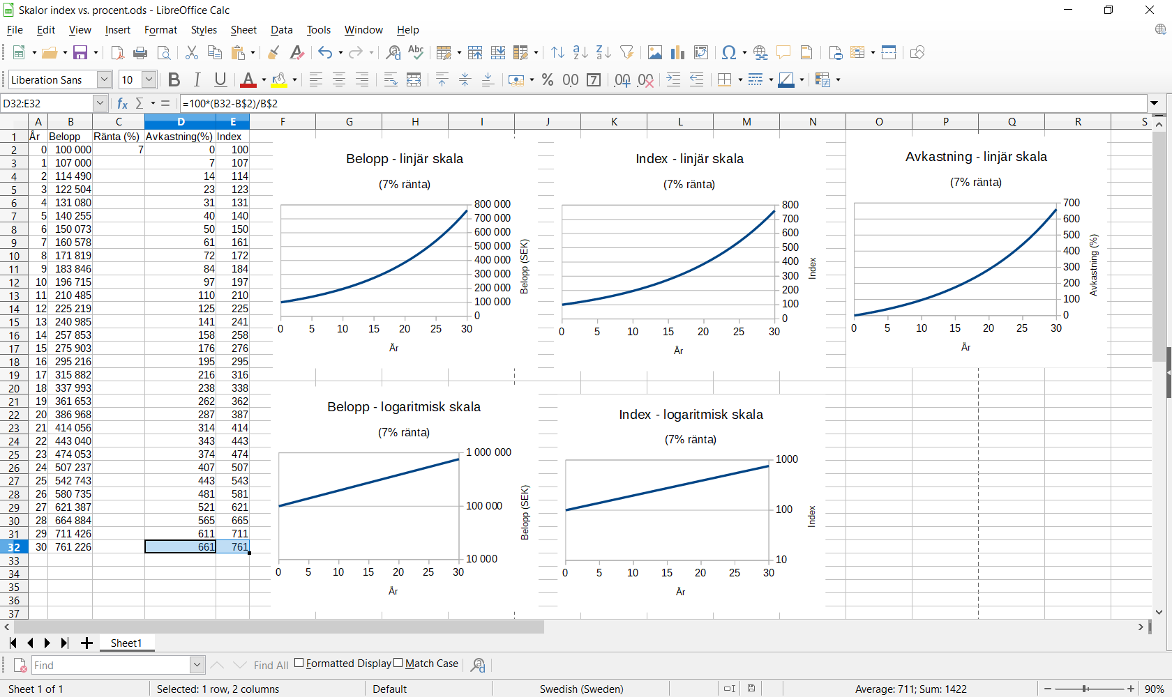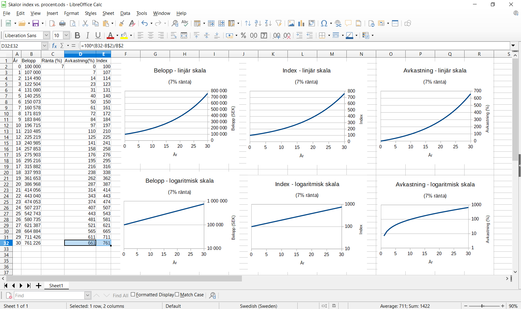 Varför får du räta linjer i dina två vänstra semilogy-plottar? Jo, i ditt excel-ark innehåller tex kolumn E (”index”) värden för funktionen y = 100 * 1.07^x. Och Log(y) = log(100) + x * log(1.07), dvs logaritmen av y är linjär i x (rak linje med lutning 1.07 i din semilogy-plot).