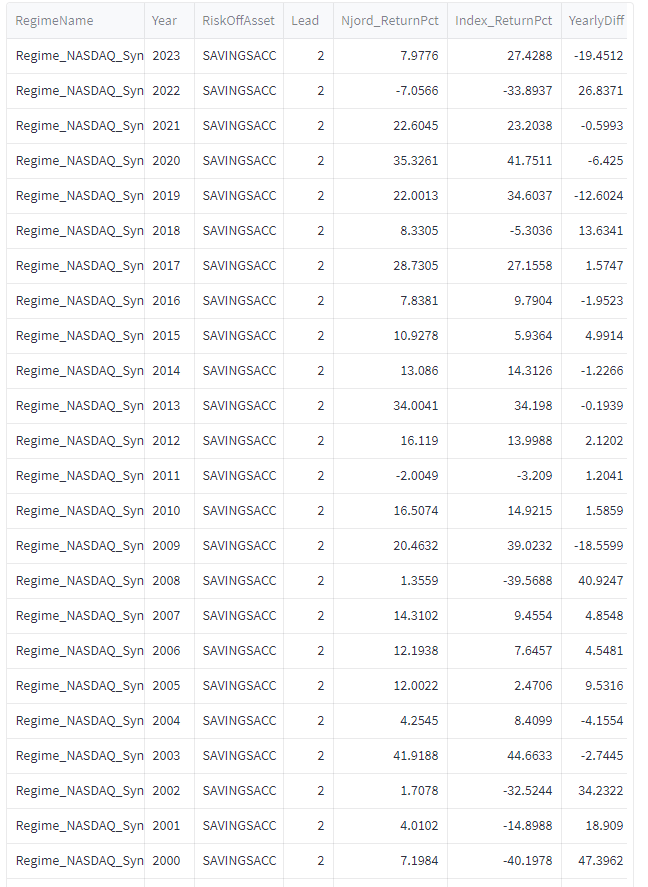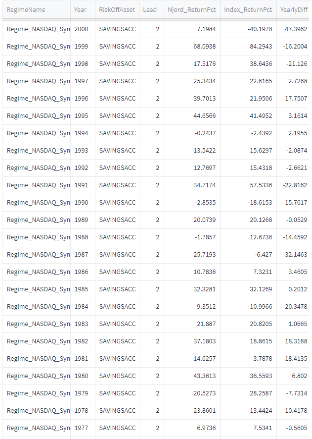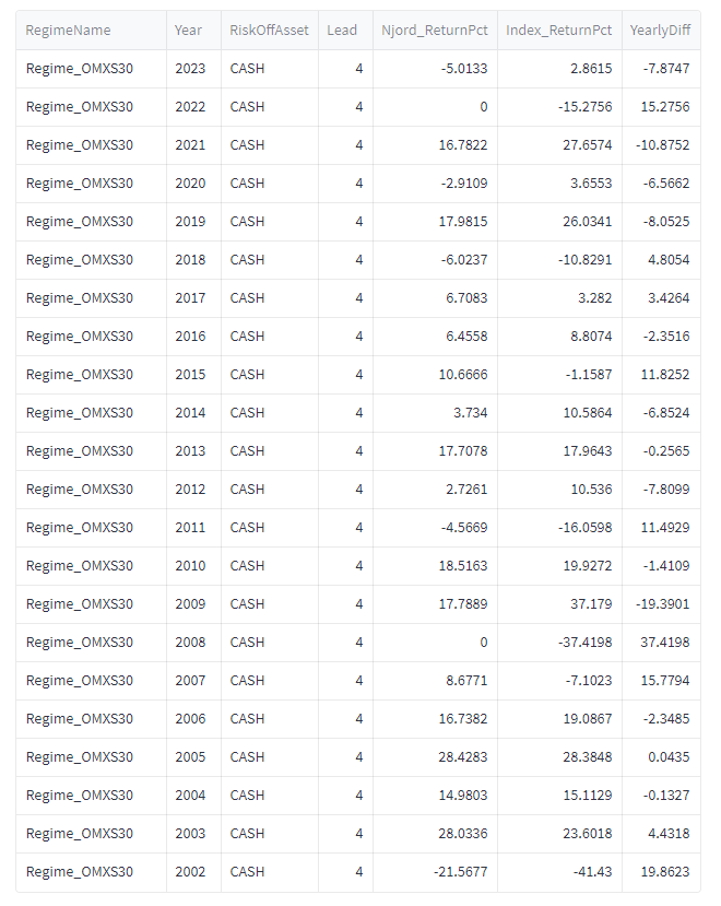 Så här ser utvecklingen ut för timingmodellen utan sparkonto om vi tittar årsvis. Njord är algoritmens namn. Lead = 4 betyder att vi 4 dagar efter signalen gör en transaktion. YearlyDiff visar skillnaden mellan Njord och buy-and-hold av indexet. Positiv YearlyDiff visar att algoritmen slår indexet.