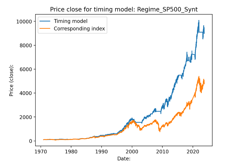 Och som logaritmisk skala:Då blir avkastningen 16.7% per år i snitt. Sharpekvoten hamnar på 1.18 och sortinokvoten på 2. Med sparkontot så hamnar vi på i snitt 2.6 transaktioner per år. 5 av 51 år så går algoritmen minus med detta upplägg: 1988 (-1.78), 1990 (-2.85), 1994 (-0.24), 2011 (-2.00) samt 2022 (-7.05). 31 år av 52 så går algotitmen bättre än indexet. Det är främst duckandet av de stora breda nedgångarna som gör störst skillnad.
