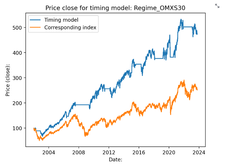 Vi hamnar då på ca 377% avkastning på 21 år, eller ca 7.45% årlig avkastning. Helt okej med tanke på att vi 35% av tiden inte tar någon risk alls. Notera att vi också börjar mitt i IT-bubblan, vilket algoritmen parerar någorlunda. Tyvärr så sträcker sig inte min data längre än så för OMXS30. Avkastningen för indexet utan timingmodellen ligger på 152%, så avkastningen är mer än dubbelt så stor för denna tid. Logaritmisk skala nedan: