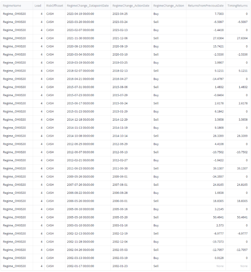 Jag har lagt in x antal släpande dagar (vanligtvis 2,3 eller 4) för att undvika lookahead bias. Transaktionskostnaden borde bli ganska låg med tanke på att det händer så sällan. Direktavkastning är inte medräknat, men kanske kan “dras av” mot skatt och andra kostnader?