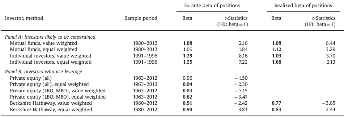 Test av verkliga preferenser i aktieinnhav för olika investerargrupper med resp. utan hävstångsaversion. Panel A analyserade innehaven hos värdepappersfonder (där regulationer gör att den absoluta majoriteten inte applicerar hävstång) samt vanliga småsparare - där hävstångsaversion sannolikt föreligger. Panel B analyserade innehaven hos riskkapitalbolag och Berkshire Hathaway - som är välkända för att köpa bolag med lånade pengar (ingen aversion föreligger). Vi ser att snittbeta hos panel A är avsevärt högre än panel B.