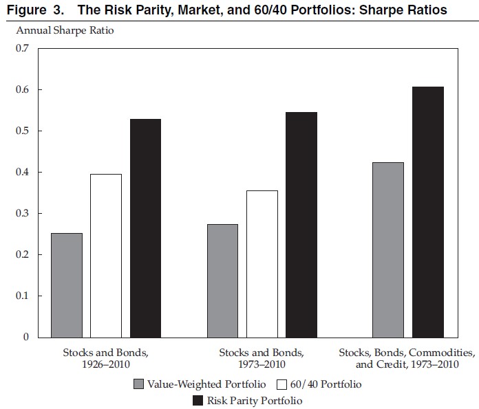 Artikeln hypotetiserar att en riskparitetsportfölj som överviktar tillgångar med lägre riskpremier kommer att belönas med oproportionerligt hög riskjusterad avkastning av marknaden, just eftersom majoriteten av investerare rent rationellt (pga hävstångsaversion) föredrar aktietunga portföljer med högre absolut avkastning. För att testa hypotesen utfördes ett grundläggande backtest med enbart aktier och räntor sedan 1926 (inga övriga tillgångsslag inblandade) i olika proportioner: marknadsvikt, 60/40, och riskparitet: