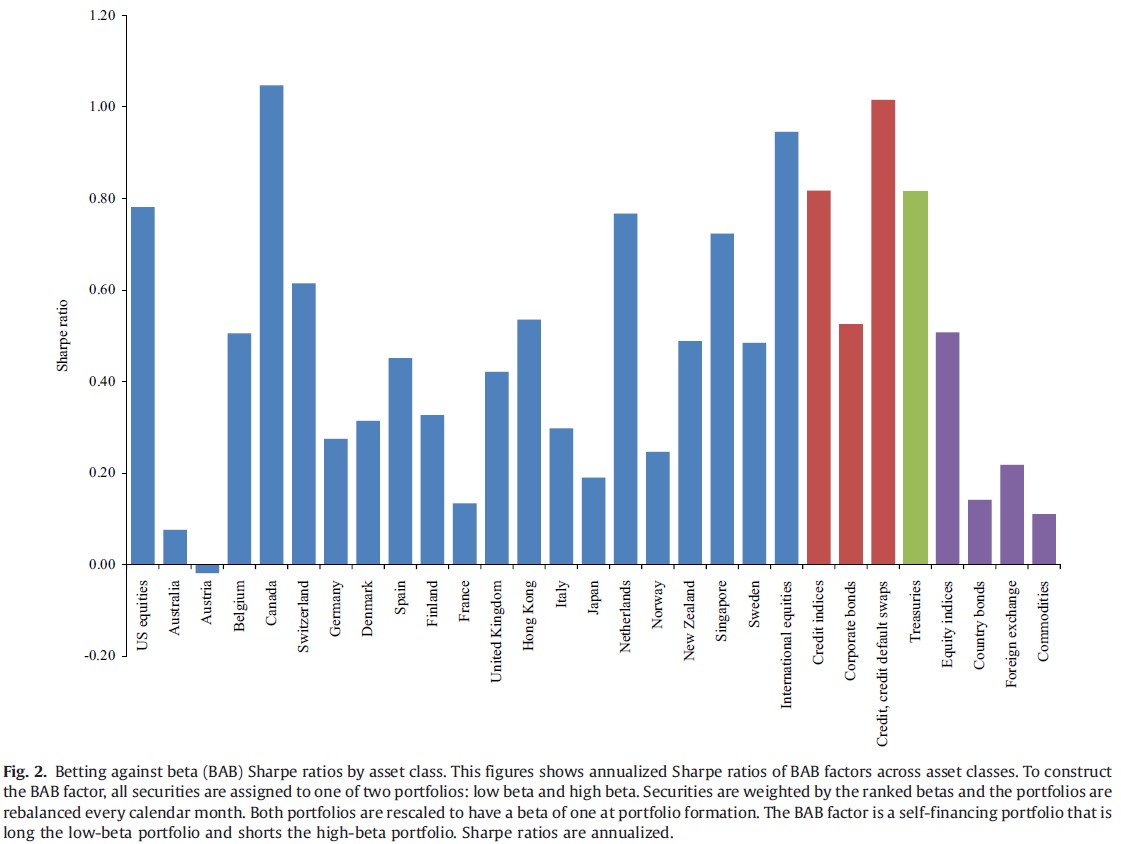 Historiska tester av Betting Against Beta-faktorn (en marknadsneutral portfölj som går lång lågvolatila tillgångar, och kort högvolatila) på aktieuniversum i olika länder samt inom olika tillgångsslag. I 28/29 fall uppvisar BAB-faktorn positiv Sharpe, och i många fall imponerande hög sådan.