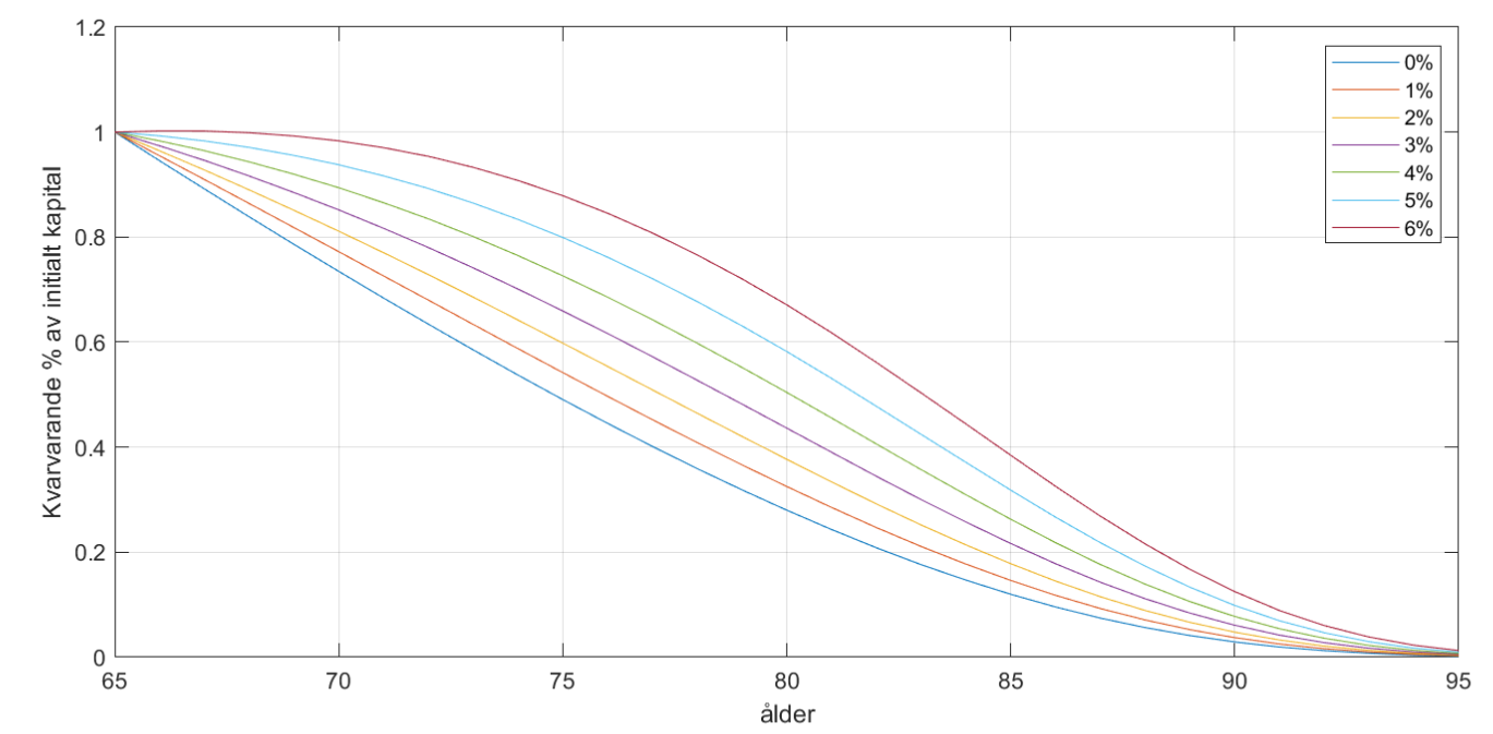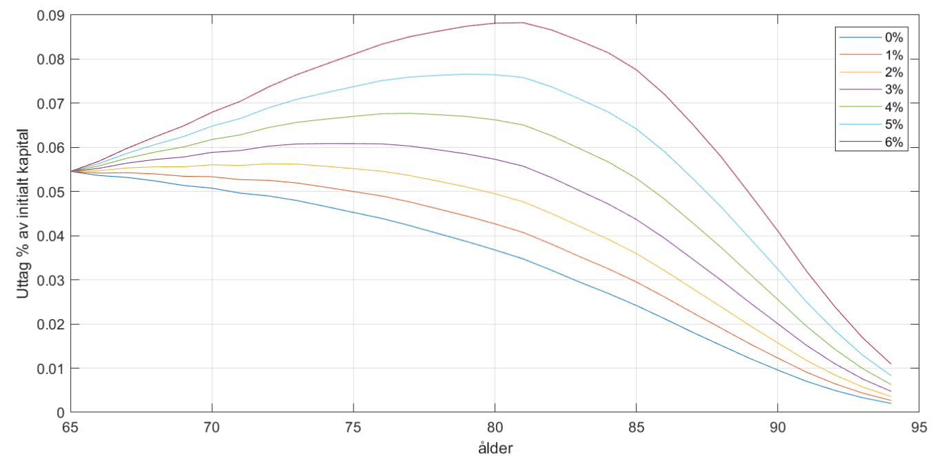 Här är resulterande uttag för olika reala avkastningar där man bara räknar om uttag varje år via invers dödsrisk.