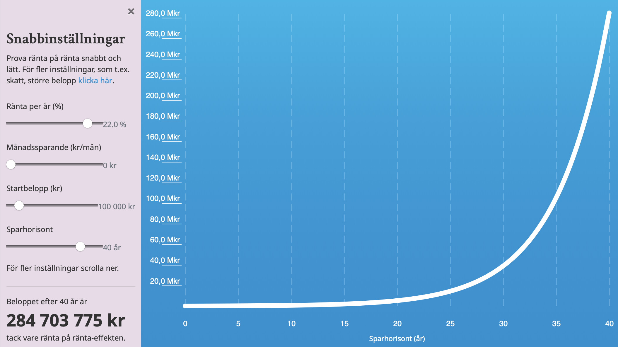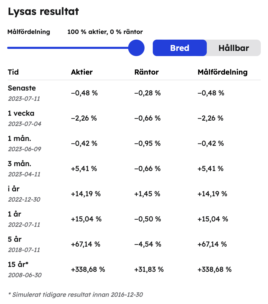 Kan lika gärna köra 100% aktier i lysa om du inte behöver pengarna. Jag satte in i lysa 1 januari 2020. Efter korona och krig och inflation ligger jag idag på 43% plus. Och det har inte gått 4 år än