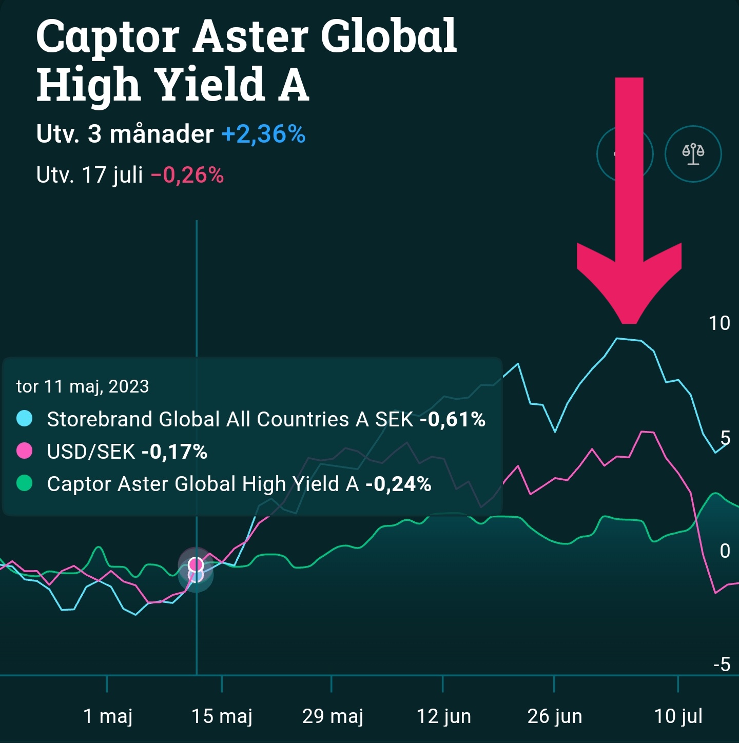 De senaste 2 veckorna (röda pilen) har varit ett tydligt exempel på detta. USD/SEK har fallit och likaså globala indexfonder, som en följd av valutaeffekten. Captor Aster har dock rört sig åt motsatt håll, tack vare valutasäkringen.