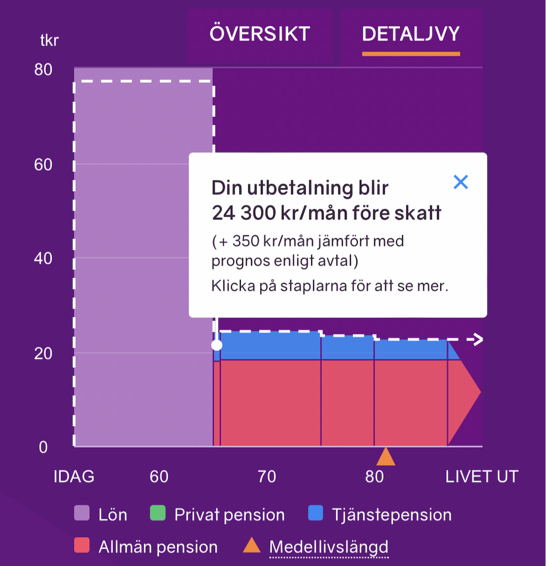 Jag har lite drygt 800 000 i allmän pension och 1 200 000 i tjänstepension. Jag har över 30 år kvar till pensionen, tjänar runt 80 000 kr/mån och får ca 15 000 kr i tjänstepension. När jag simulerar värdeutvecklingen, som jag inte har gjort några ändringar i, säger prognosen att min pensionsutbetalning beräknas bli 24 300 kr/mån före skatt – en minskning av min nuvarande inkomst med 55 700 kr/mån. Kan någon hjälpa mig förstå varför det ser ut så här?