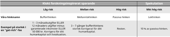 Fyra-hinkar modeller råder till att man har åtminstone 3 årslöner i en 60/40 portfölj. Vill man så kan såklart förenkla det genom att sätta 1.25x årslön på sparkonto och resten i 90/10 eller 100/0 portfölj.