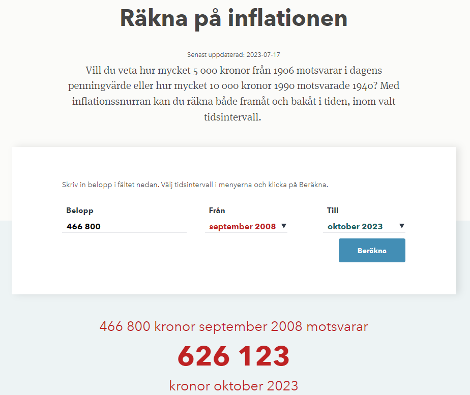 Nja, värdena är nuvärdesberäknade, dvs du ska i stort sett ha “samma köpkraft” som den summan motsvarade det året. Det innbär att de 466 800 kronor motsvarar idag 626 123 kronor.