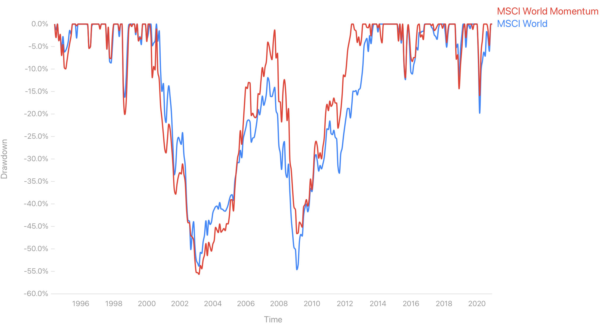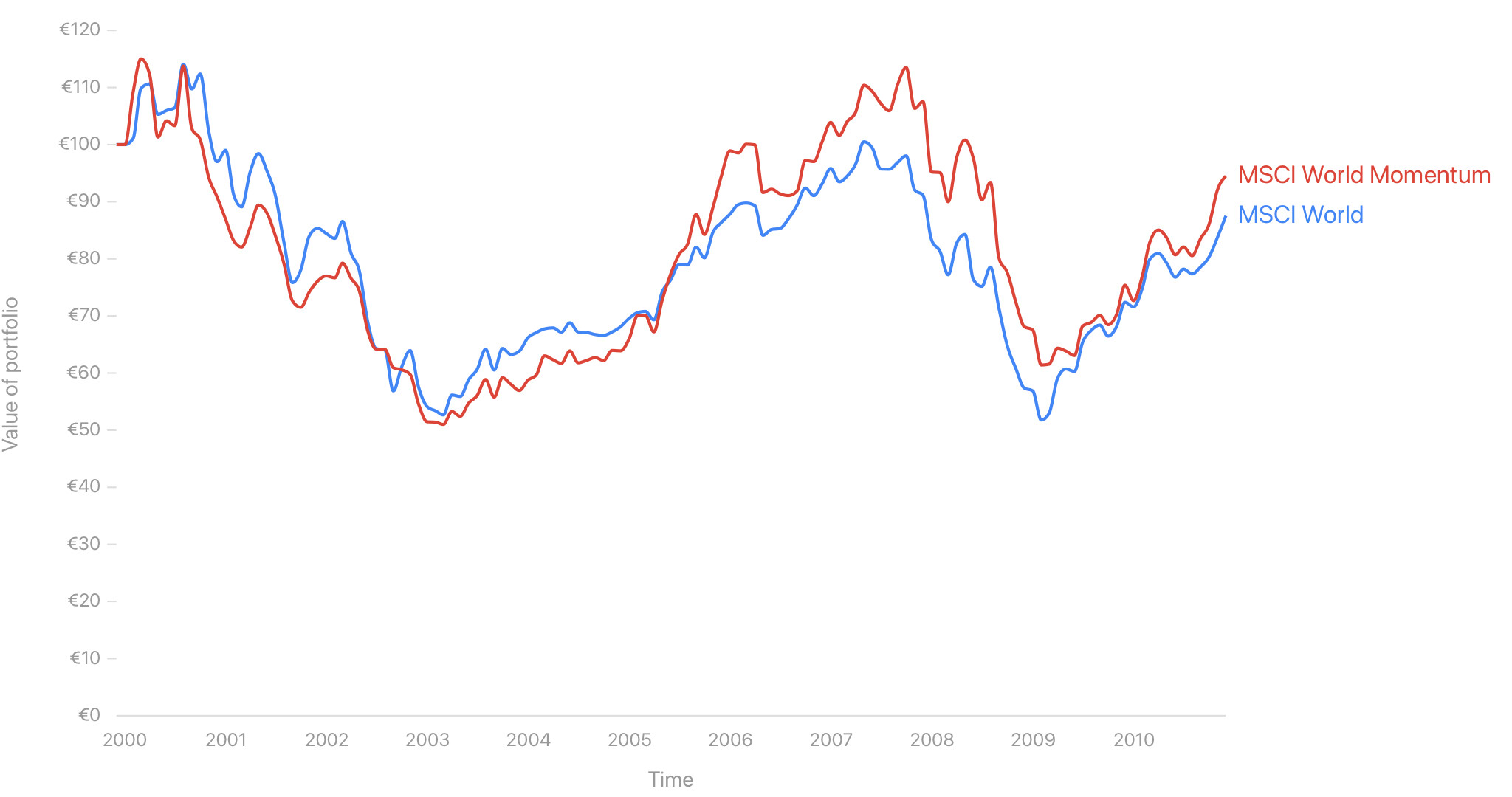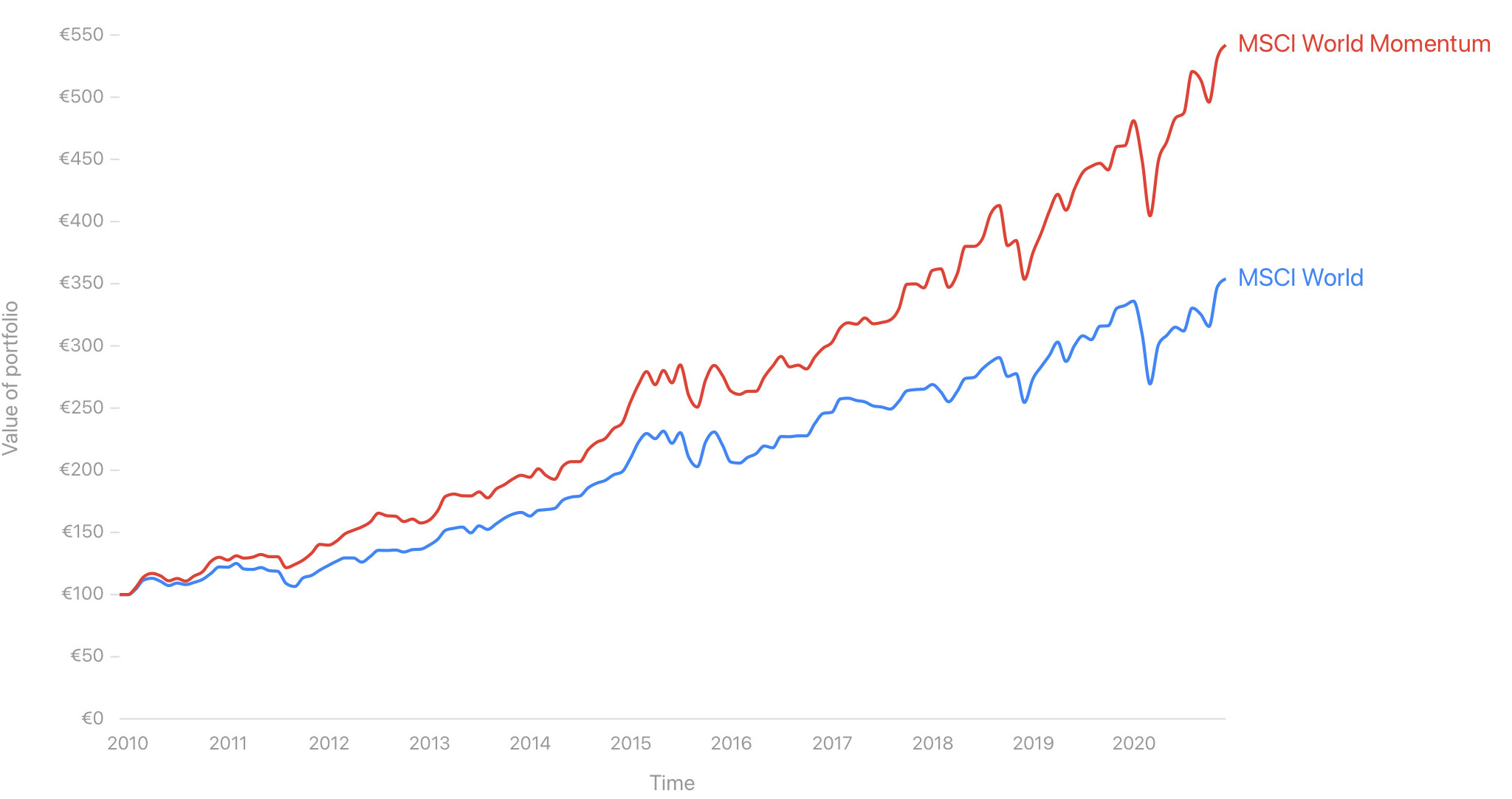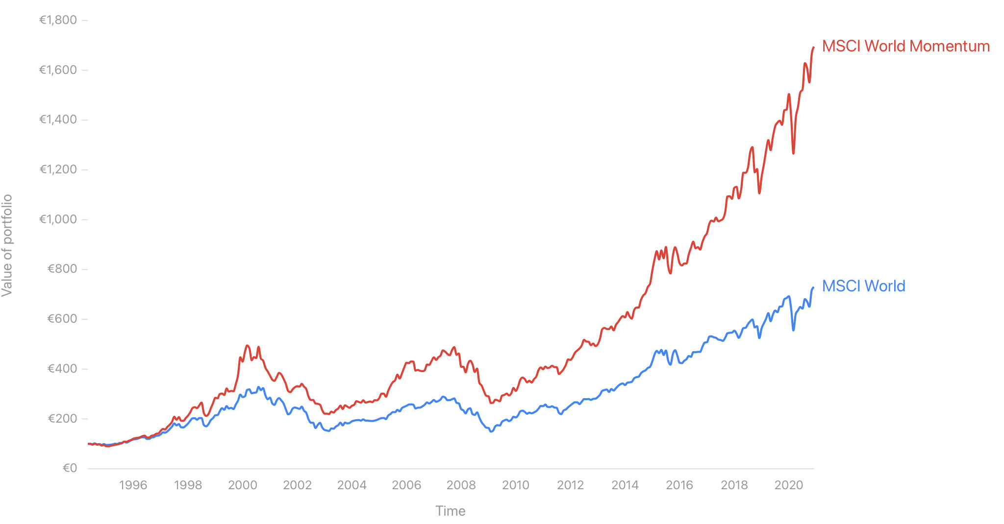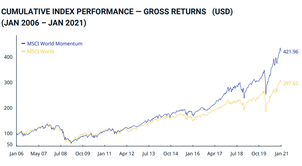Om man vill göra det lätt för sig kan man jämföra MCSI World Momentum Index med MSCI World Index.