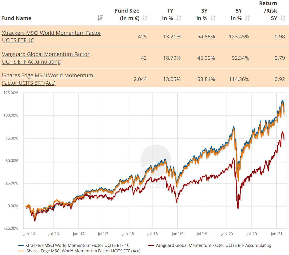 Tolkar att Vanguard kör en egen momentum-strategi medan Xtrackers och iShares följer MSCI World Momentum.