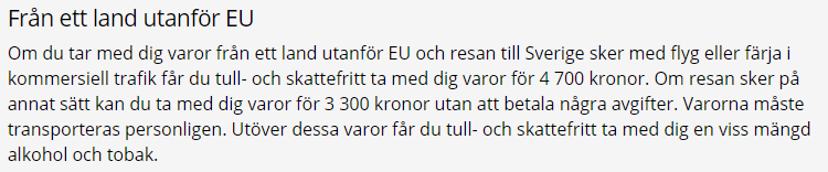 Exemplet nedan gäller för införsel av varor till Sverige men frågan här handlar alltså främst om införsel av varor inköpta i Sverige till andra länder. Det är inköpen i Sverige som jag är intresserad av, inte införseln. Där finns som sagt varierande regelverk.