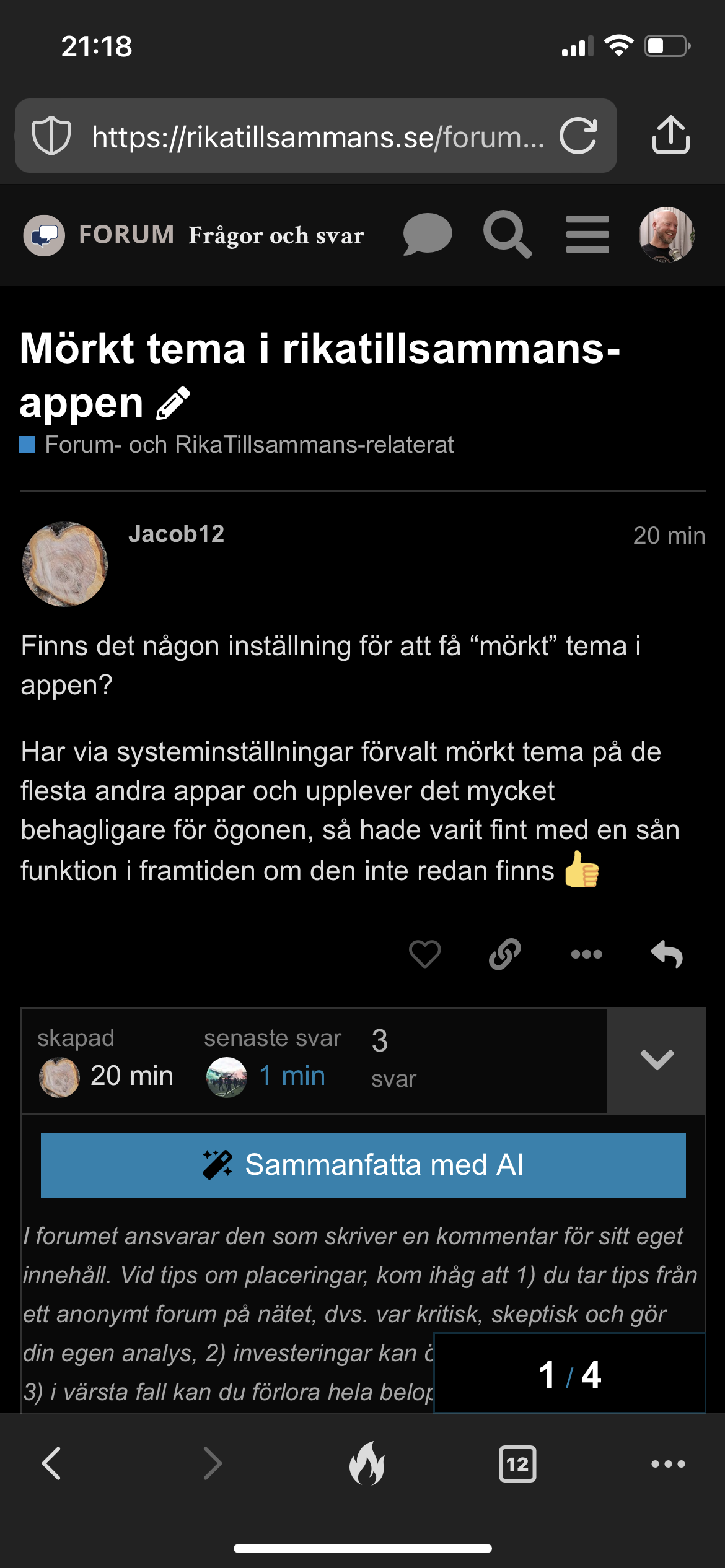 Har via systeminställningar förvalt mörkt tema på de flesta andra appar och upplever det mycket behagligare för ögonen, så hade varit fint med en sån funktion i framtiden om den inte redan finns