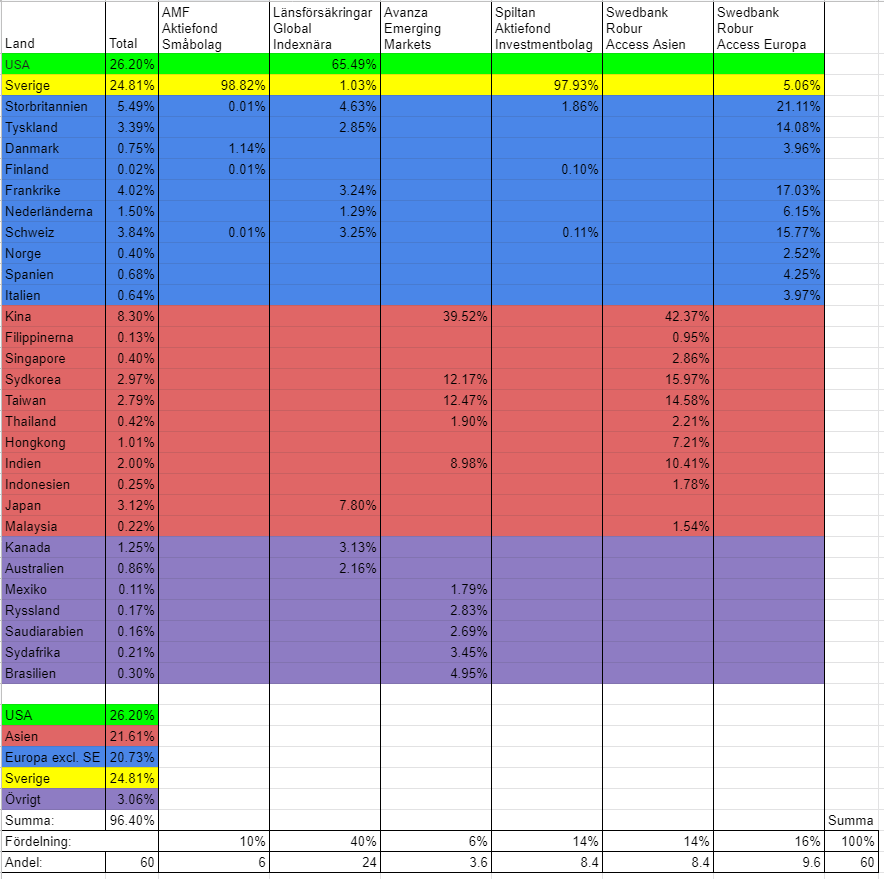 Här kommer min X-ray och den kommer inte vinna några priser för snygg design men går ju ganska mycket snabbare än Morningstars verktyg och framförallt så fungerar det. Balanserar om portföljen en gång om året och kan stå ut med att mata in fördelningen då, samt att det var ganska intressant att se vad som var med i fonderna vilket jag egentligen inte tänkte så mycket på tidigare.
