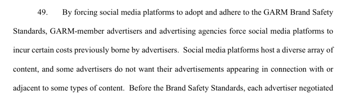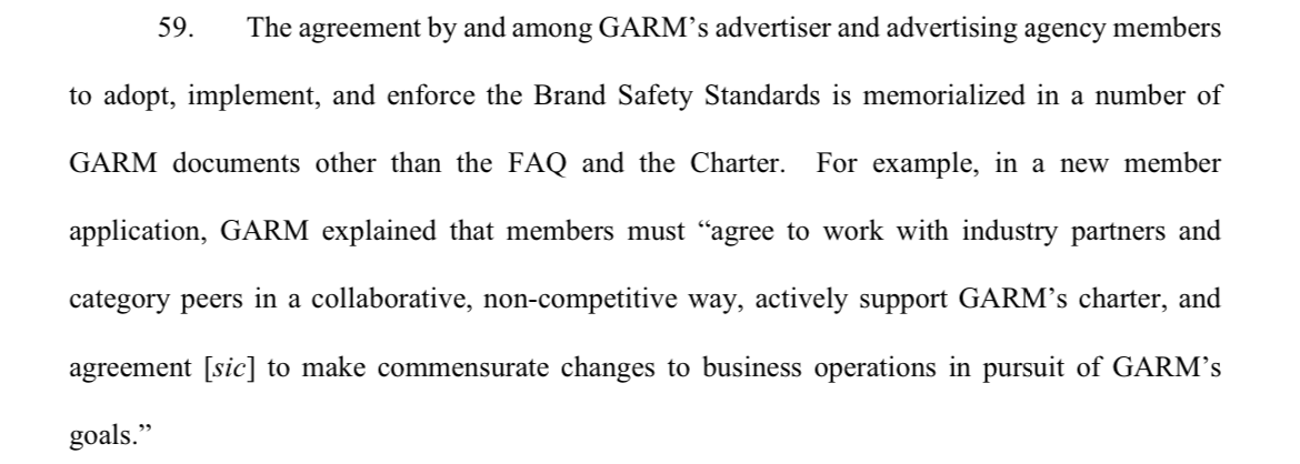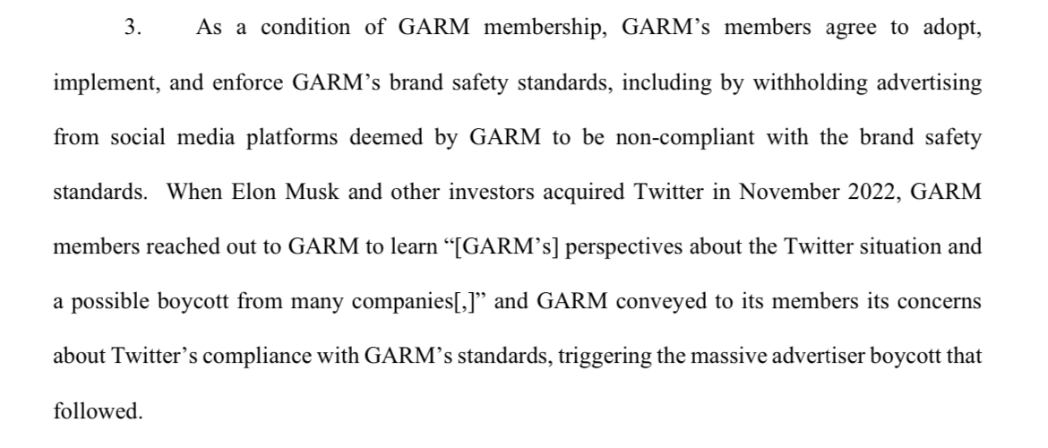 Musk anser att Garm (annonsföretagens förbund) -kollektivt- försökte få X att ändra sin content-moderation och vilka som skulle bannas på platformen enligt deras egna preferenser och om X inte gjorde som dom sa så skulla alla annonsörer bojkotta plattformen. Dvs, man försökte använda sin makt för tvinga sociala mediaplattformer att följa deras riktlinjer, vilket skulle kunna ses som olaglig marknadspåverkan, vilket är vad X hävdar i stämningen.
