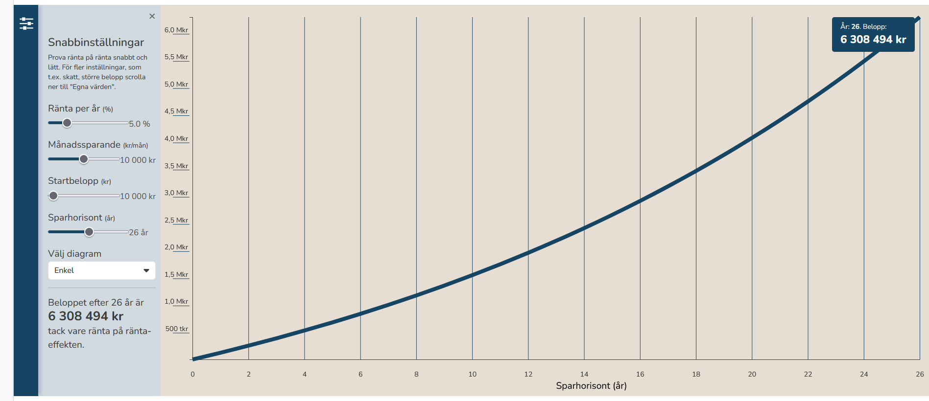 Eller lägga 10 000kr i månaden i en globalfond med en lågt räknad avkastning på 5%. Det betalar av lånet på samma tid men ger dig 3 000 000kr extra på kontot när huset är betalt.