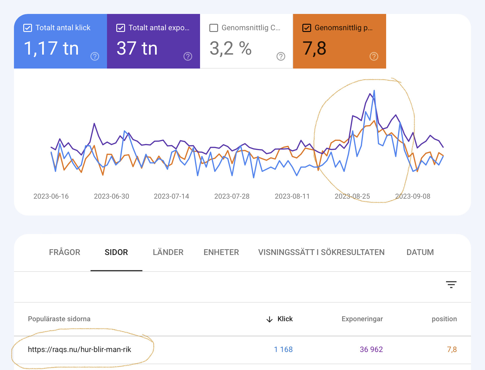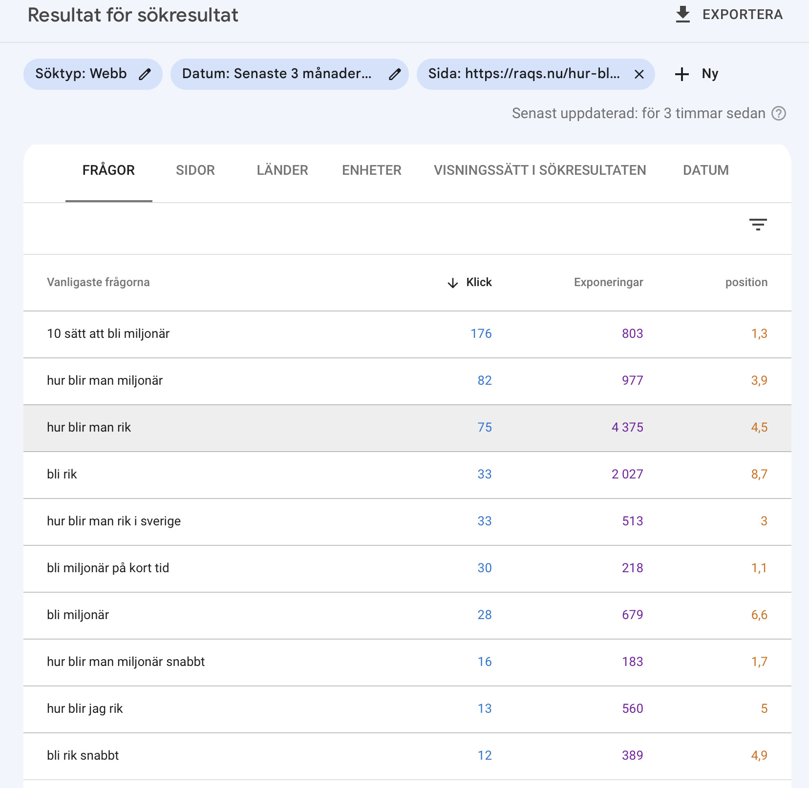 Bild 1 visar sidans resultat på Google de senaste 3 månaderna. Vi ser en tydlig ökning av frågor kring hur man blir rik direkt efter semestern. Jag ser detta även efter julledighet.