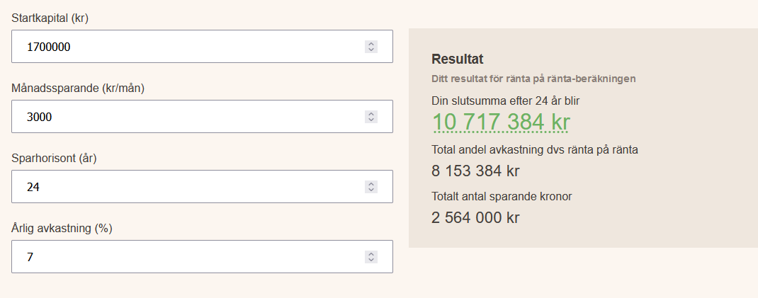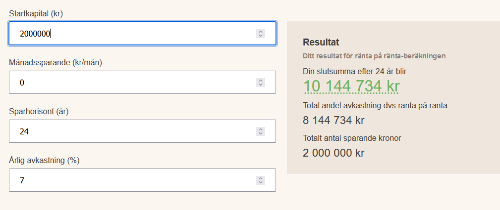 sparande á 4000kr i månaden i 20år med 7% avkastning är 2msek.