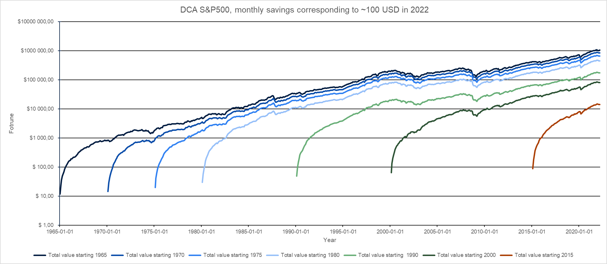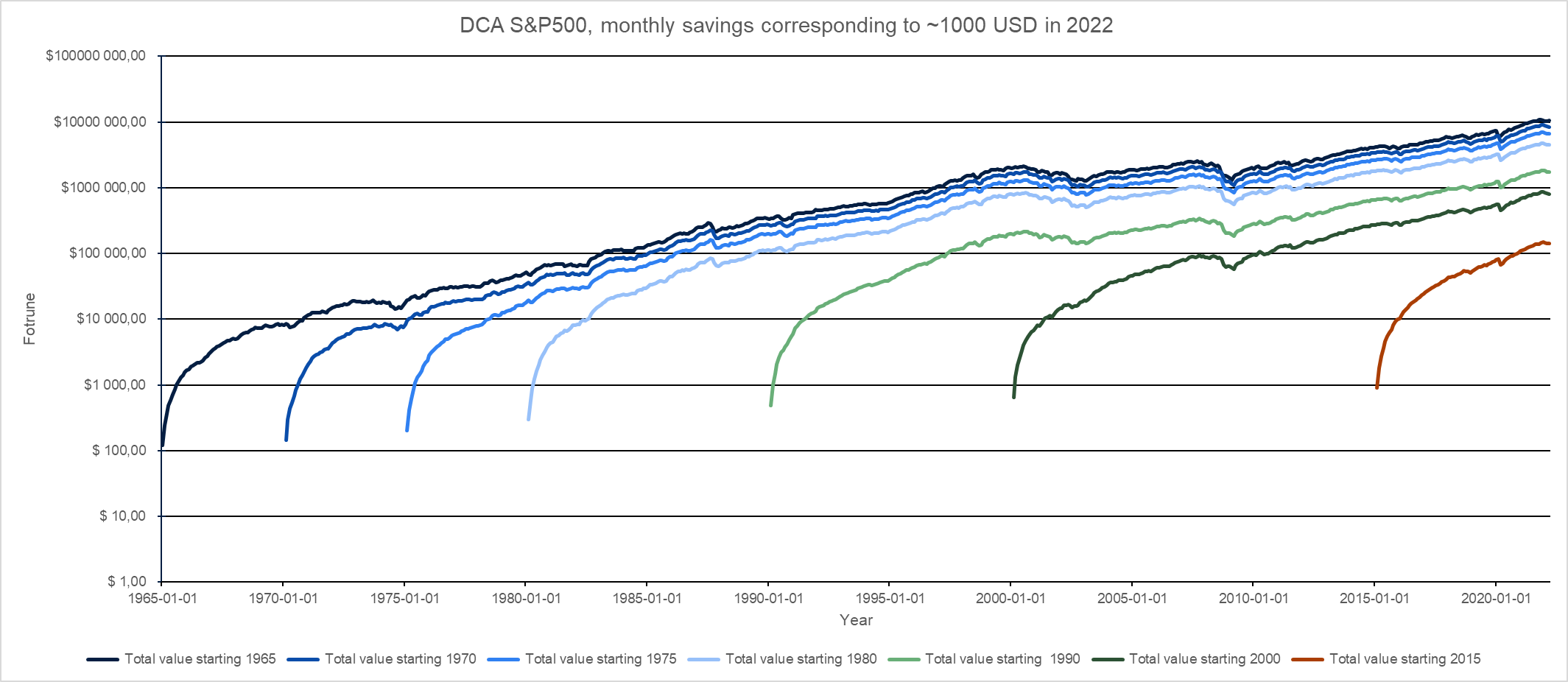 Jag satt och lekte i Excel en kväll och räknade på månadssparande/DCA på cirka 100 USD per månad i 2022s penningvärde som sätts in i S&P500. Måndadssparandet är uppräknat med hjälp av CPI från 12 USD 1965 i bilden nedan. Jag satt och klickade runt lite och försökte förstå mig på datan och hittade detta (OBS LOG skala på Y-axeln):